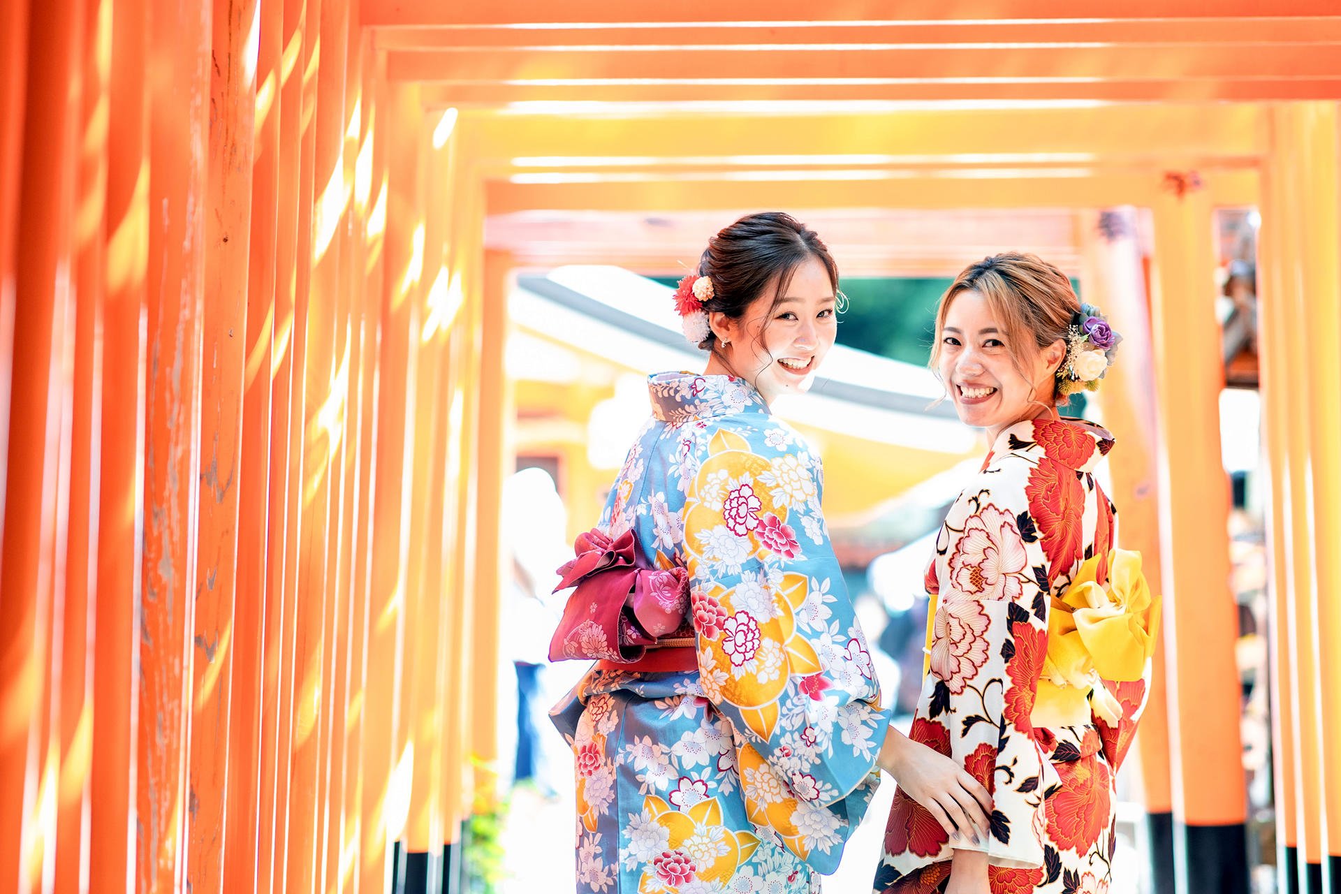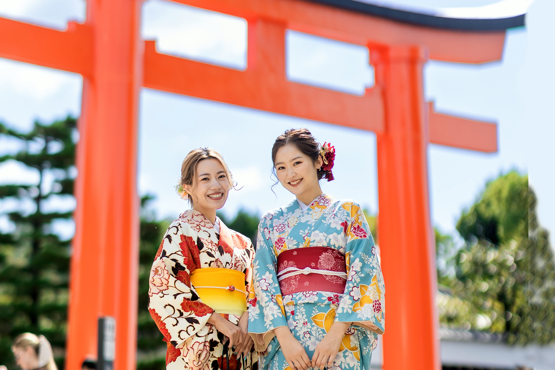 Exit JR Inari Station and you’ll see the iconic vermilion torii gate entrance to Fushimi Inari Taisha Shrine on your left. Turn left from the station and walk along the street for less than 1min. The tea ceremony venue and Kimoto rental service is located  beside the vermilion torii gate.